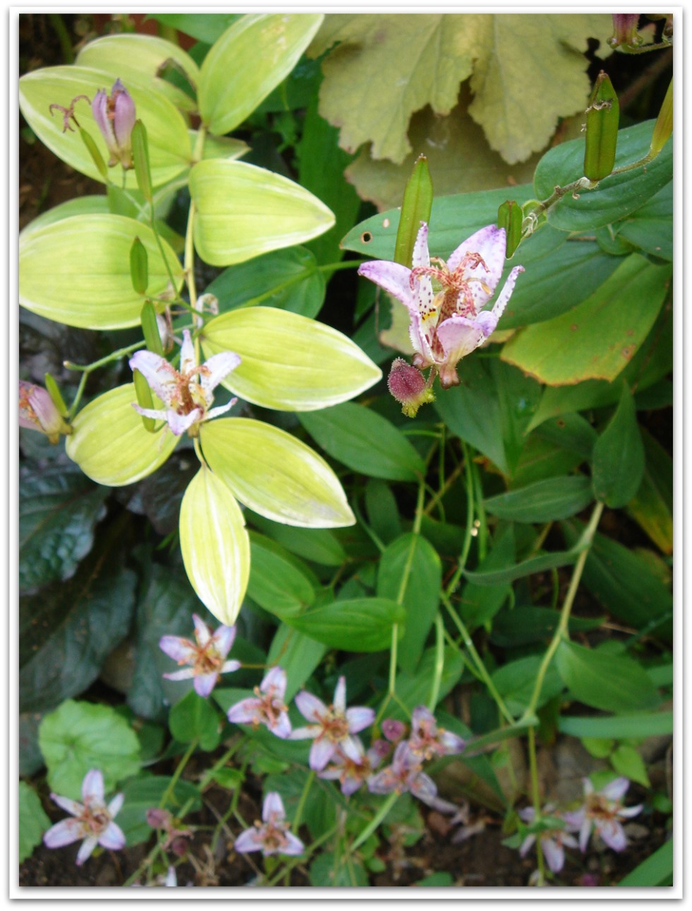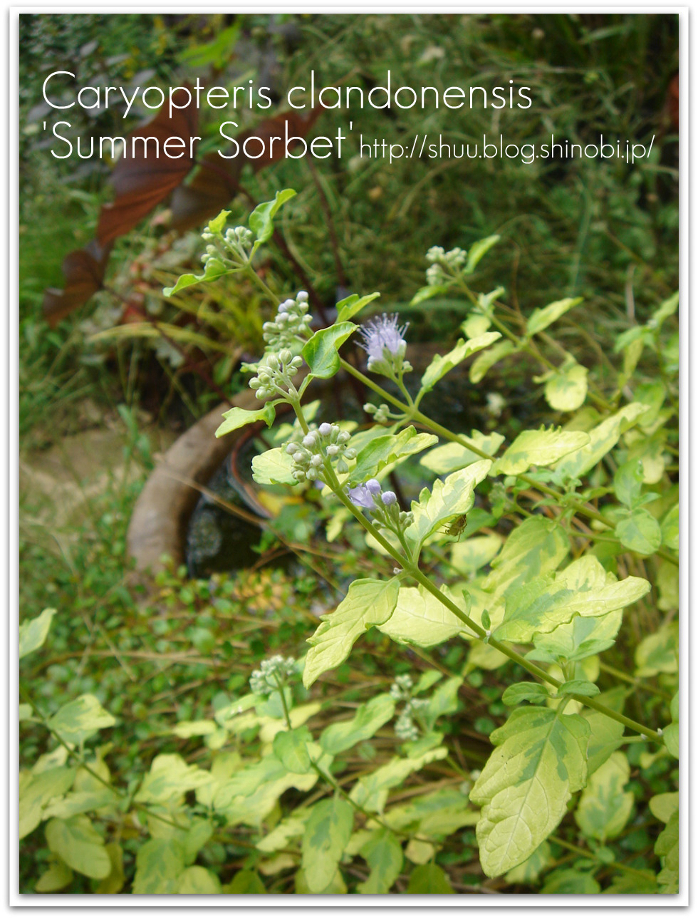 黄色系の明るい斑入りの葉が魅力的なんですが、ちらほら、花も咲き始めました。