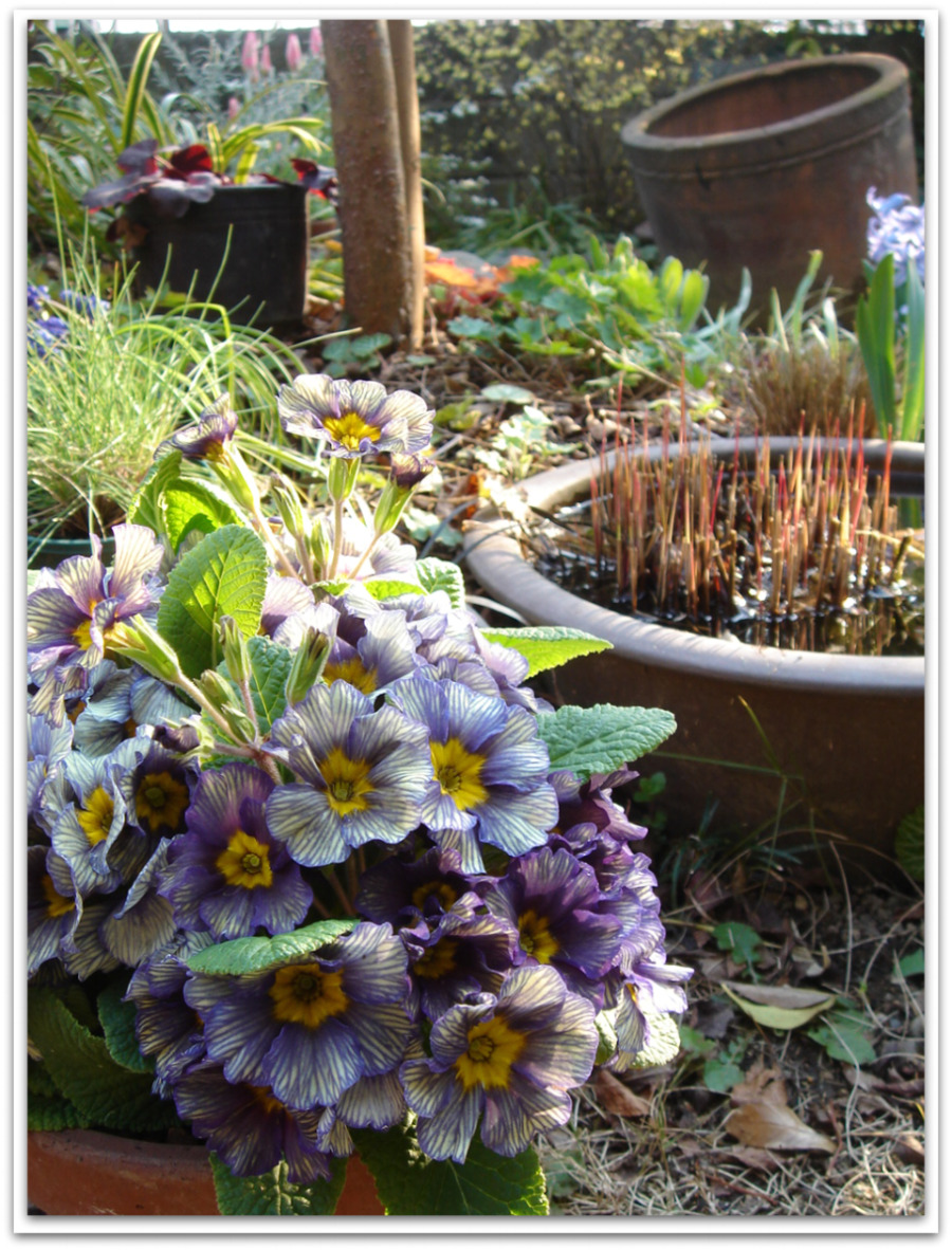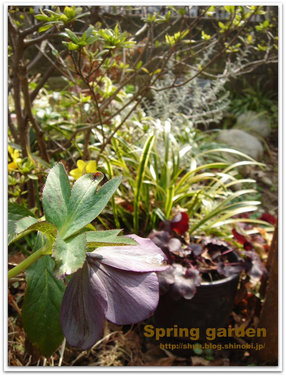 花が引き立つよう、斑入りのツルニチニチソウの前に鉢を置きました。