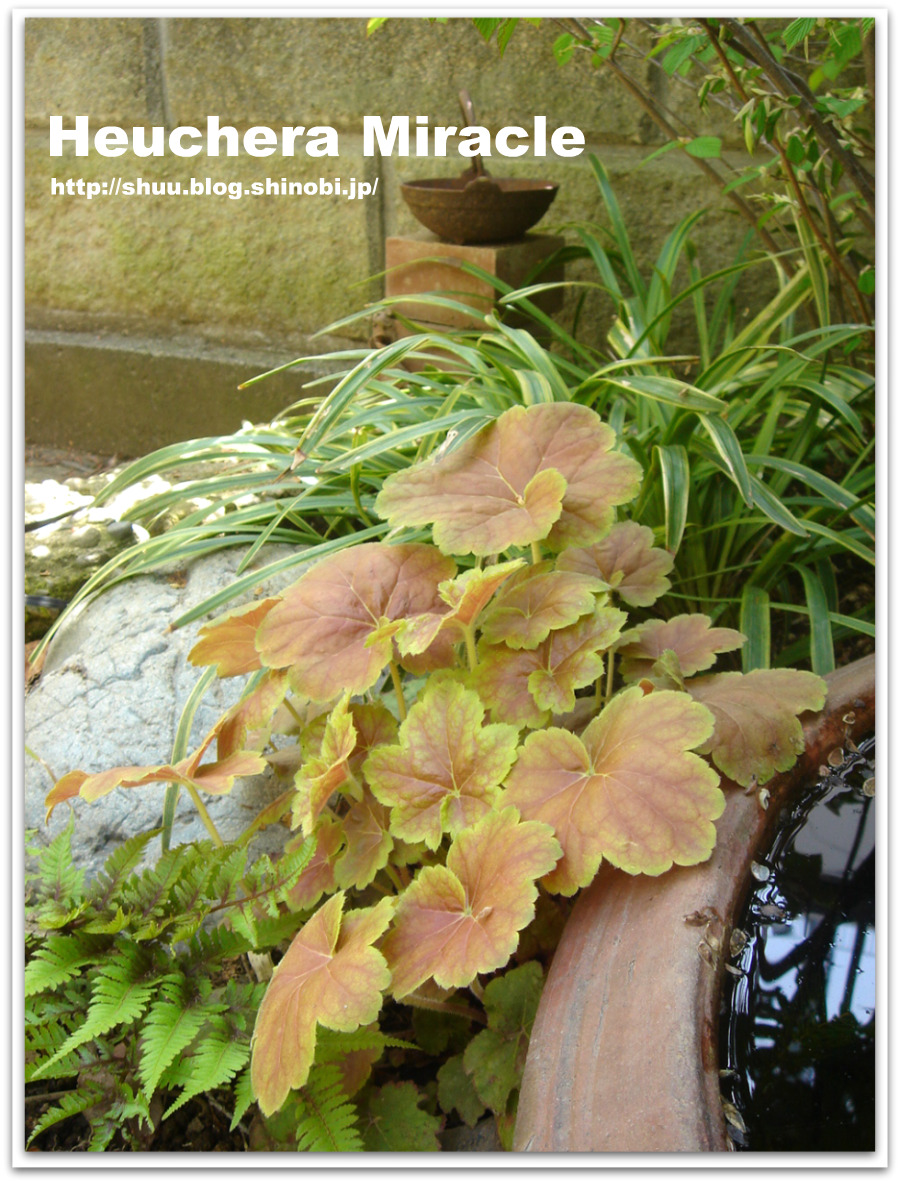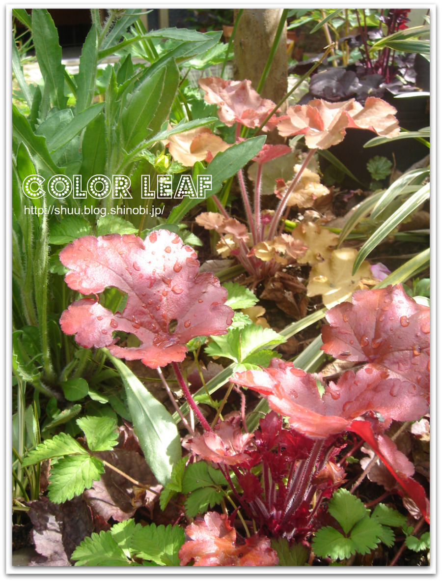 その手前には、『ヒューケラ・オブシディアン』の鉢など。。
