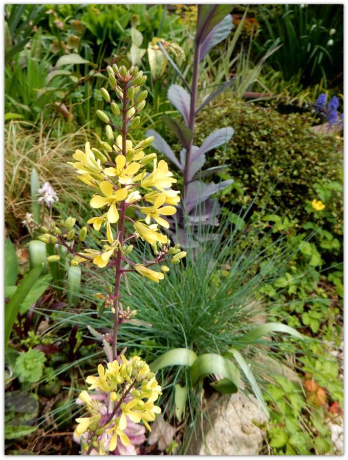 奥では「ヒュウガミズキ」の黄色い花が真っ盛り。