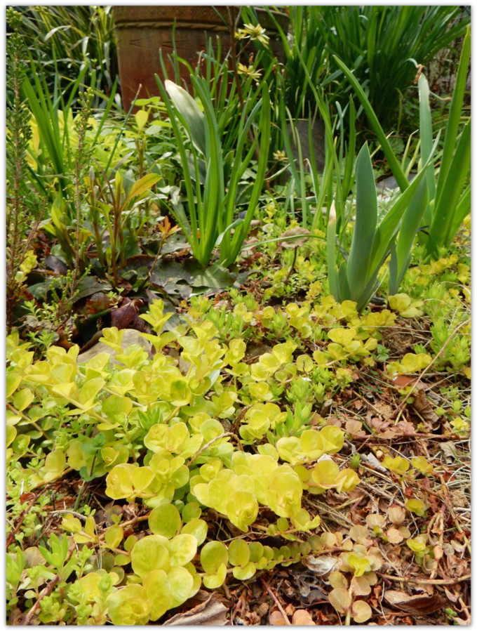 リシマキアの他に、『ツルマンネングサ』や勝手に生えてきた『コモチマンネングサ』と、ごちゃごちゃと共存してます。