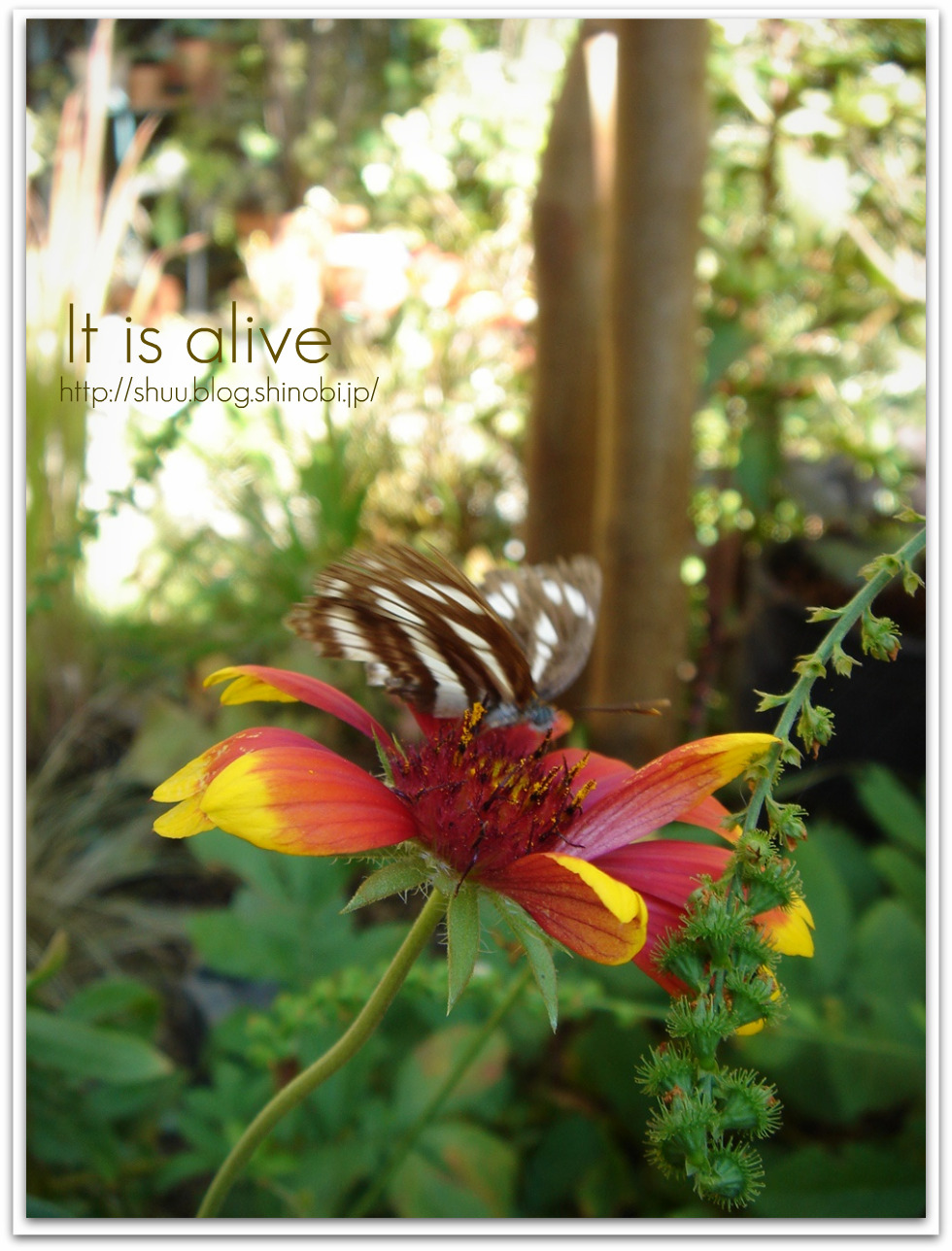 ←台風の中、頑張ったのね、、羽がボロボロのチョウチョ。