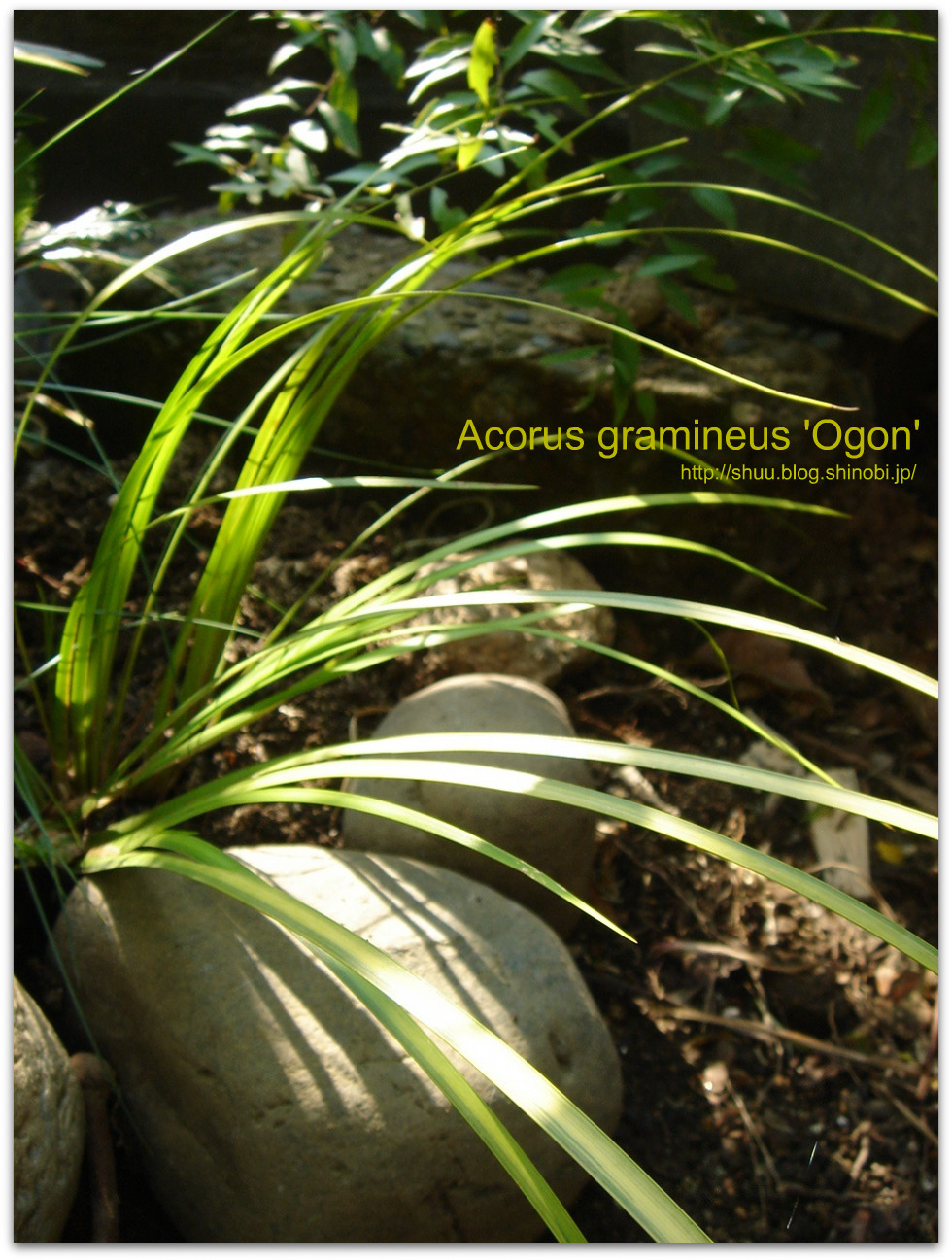 直立の葉っぱは、水鉢の中の『ベニチガヤ』