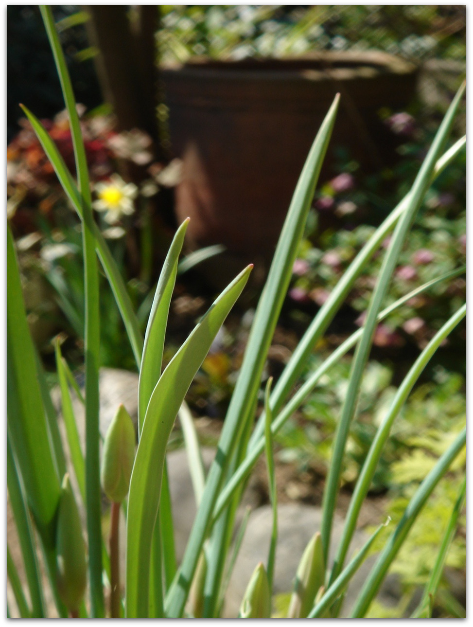 鉢に植えて2年目の原種系チューリップ『レディージェーン』のツボミ越しに、西の庭を。
