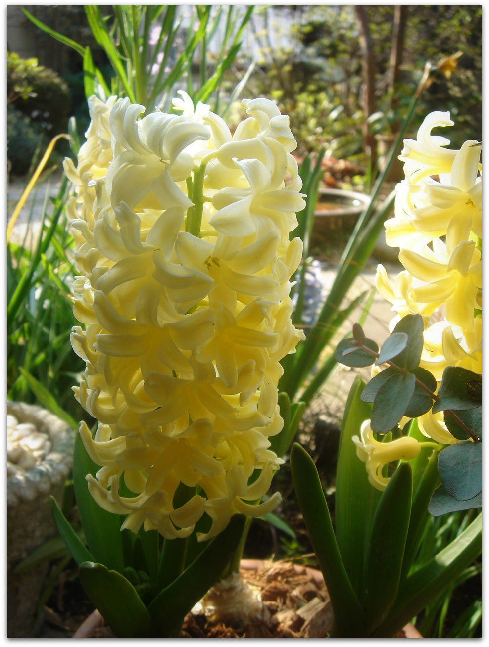 あ、上の子の選んだ、黄色いヒヤシンス(左端)が咲いてきました!なかなか、優しい色合いでよいじゃなーい。