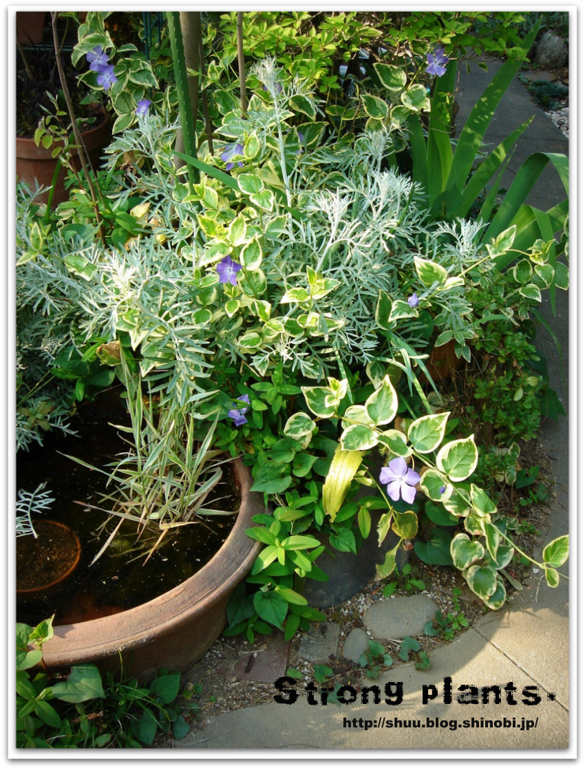 ほっとくと、勝手に塀にくっついてのびますが、『アイビー』ほど、がっちり吸着しないので、いやになったらはがせるのがいい。