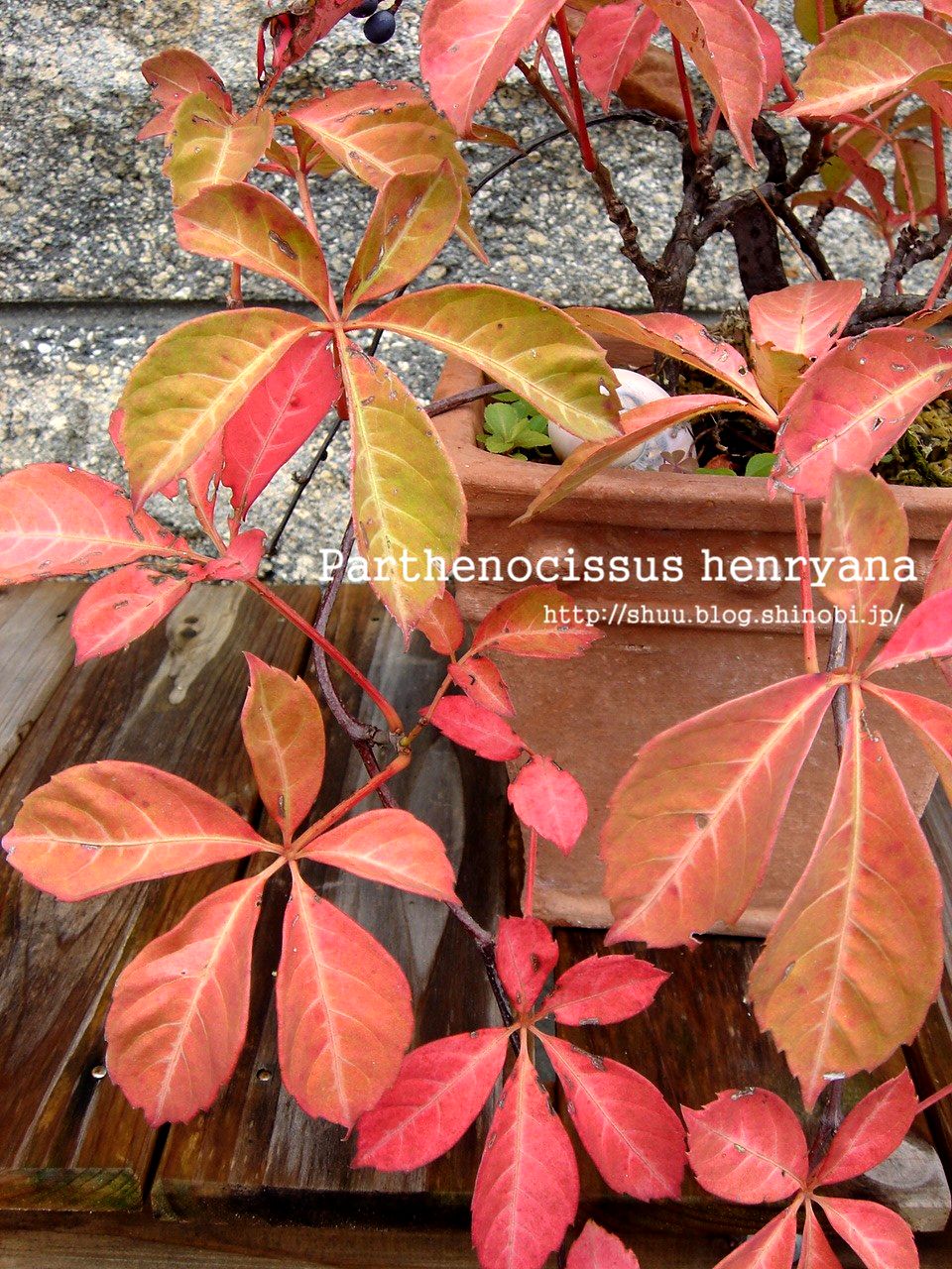 鉢植えのヘンリーヅタが、もう紅葉。