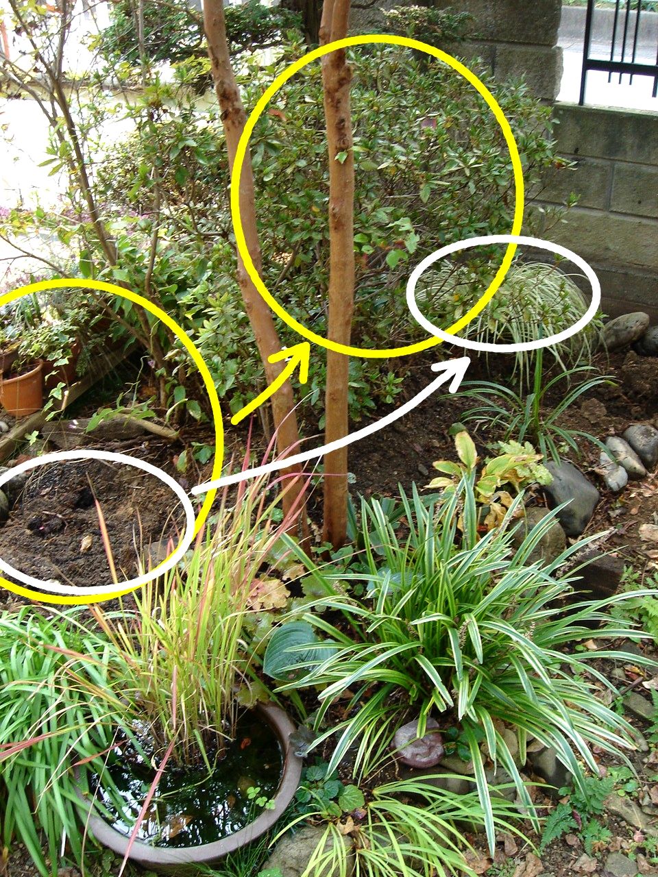 東側の花壇。・・に置いてある鉢植え。
