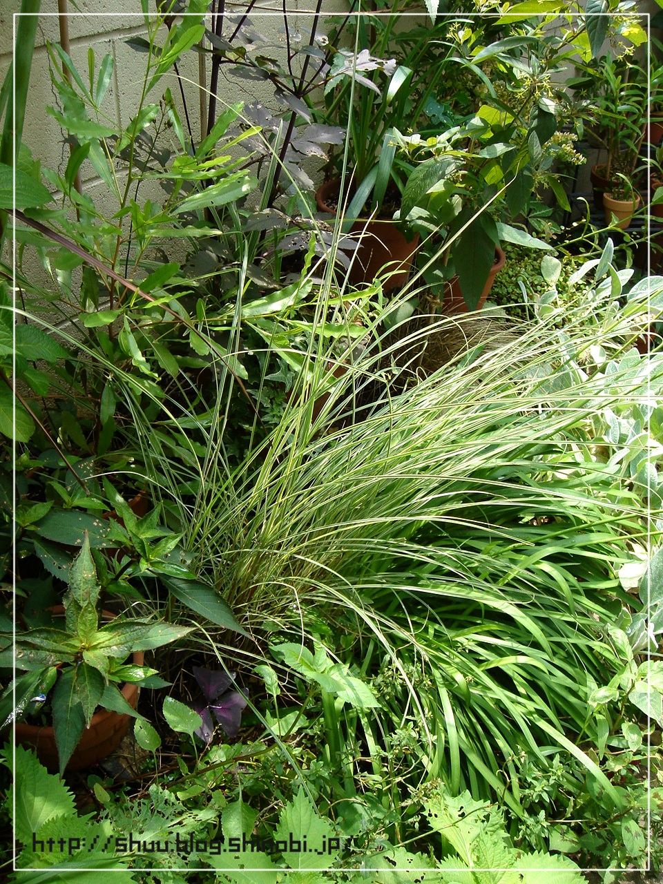 後ろの葉っぱは水鉢の中の、『ベニチガヤ』