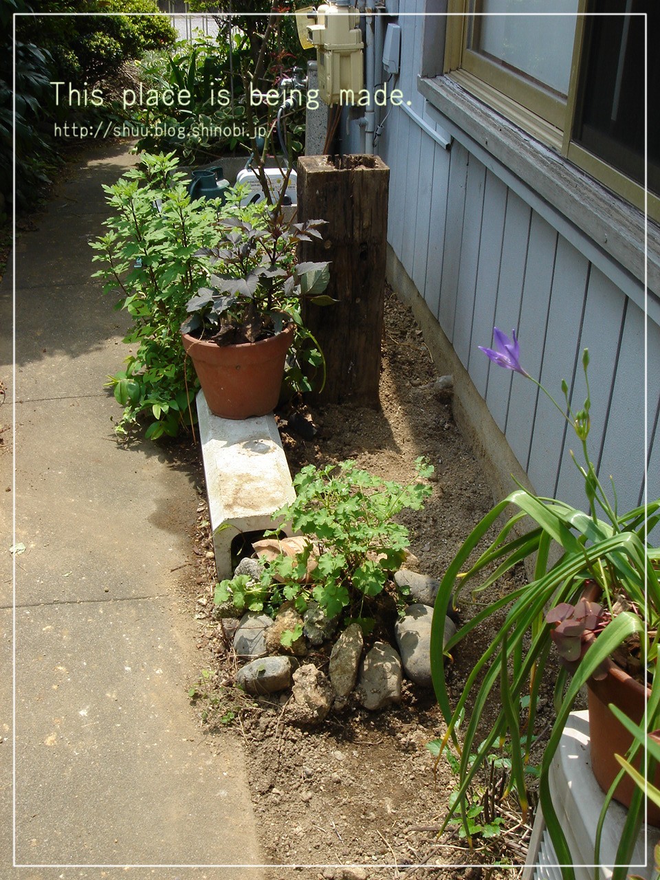←奥は、この庭にあったコンクリート平板や、買ったものやらで作ったテラス?部分。