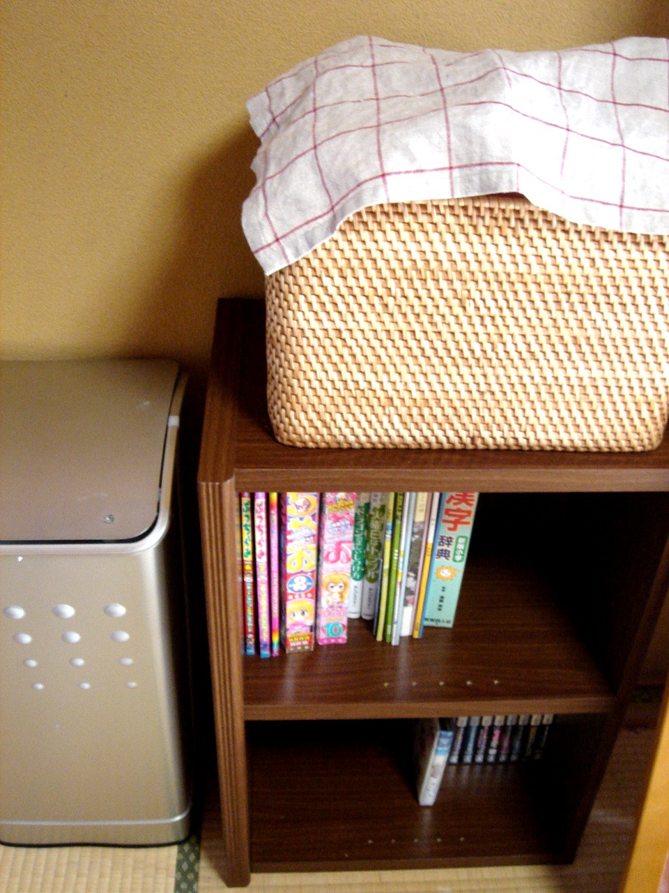 (ちなみに上に乗ってるラタンのカゴは無印良品。左のDULTONのゴミ箱はペダル式ですが、チビにイタズラされないため反対向きに)