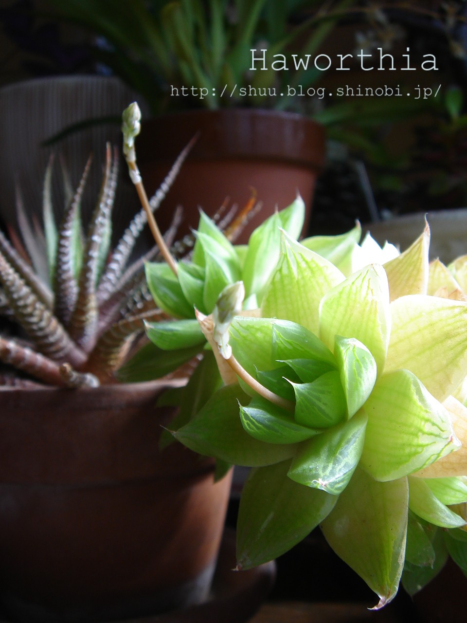 →まったく手をかけないで育ってます、暴れ『ハオルシア』から、いつの間にか花芽が伸びてきてました。