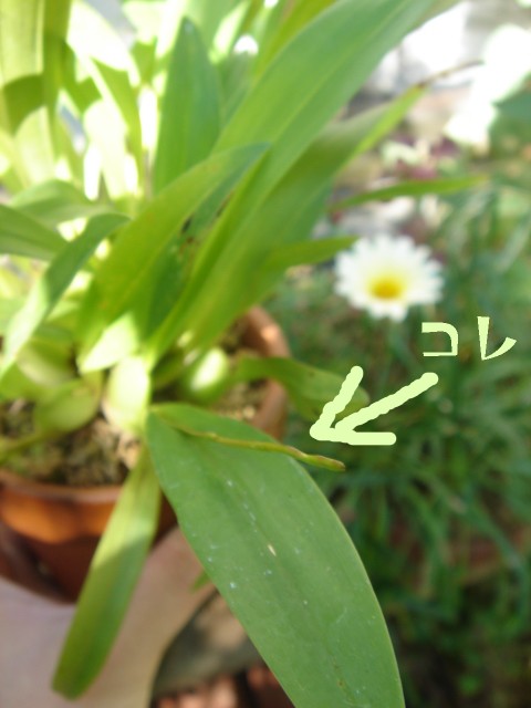 小型の蘭の花芽が伸びてきたんです。