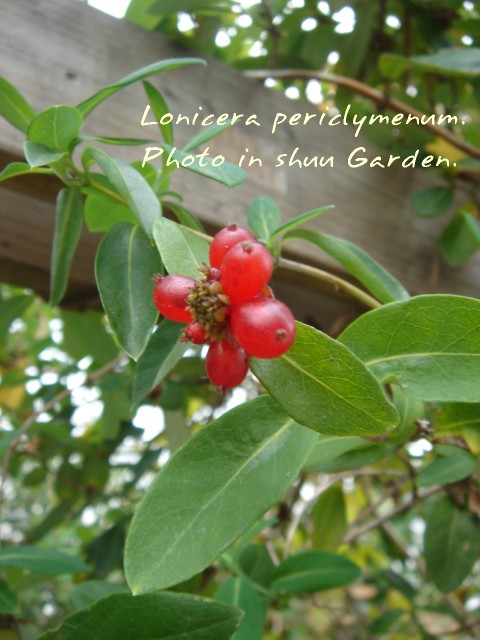 →庭のアーチではスイカズラに実がついていました。