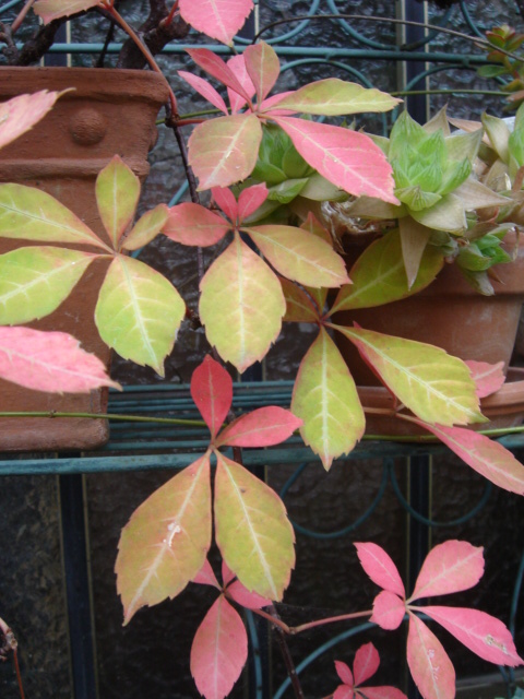 外の日当たりにあるヘンリーヅタが、いち早く紅葉しています。