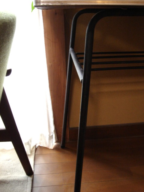 見覚えありません?昔、どこの家にもこんな足が鉄で、天板の回りがアルミみたいな素材でぐるりと囲まれてるテーブルってありませんでしたか?