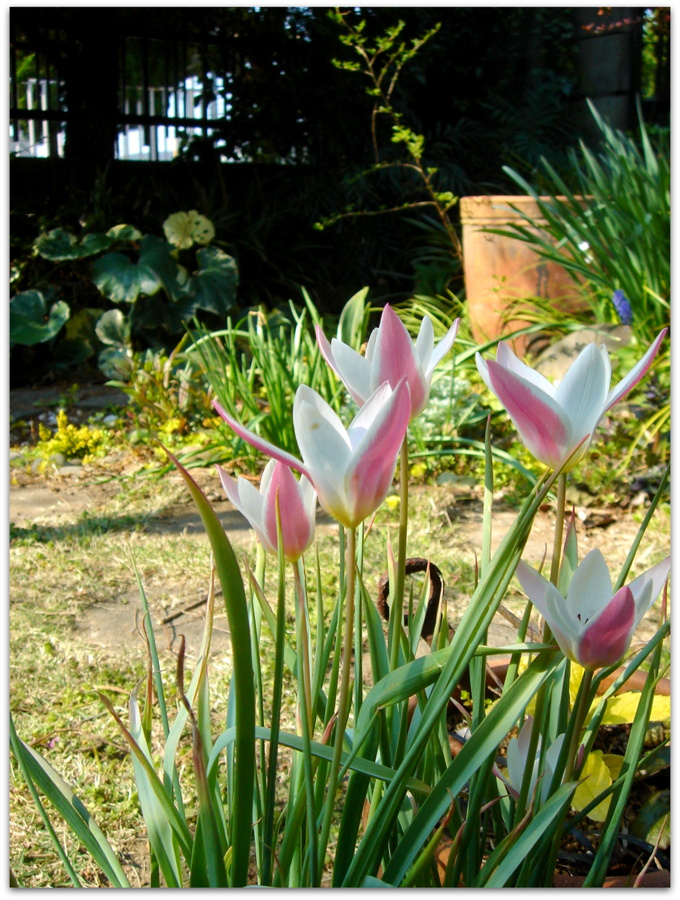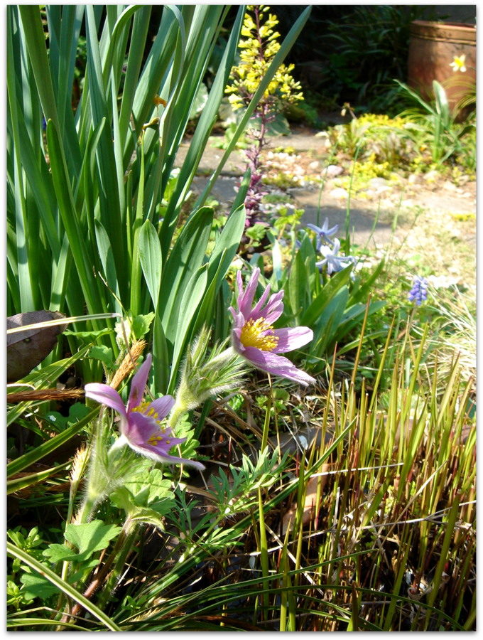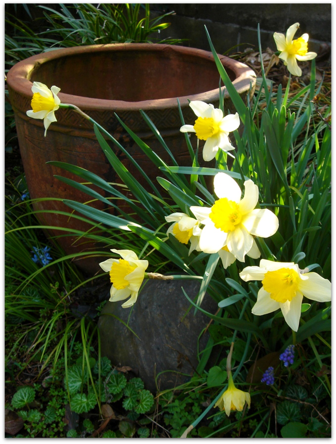 背後スイセンの長い葉っぱ、いずれ枯れてしまうので、今だけの美しい共演。