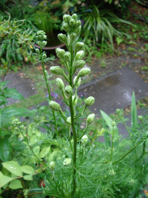 ←雨の中、すっくと立つ『ラークスパー』の蕾。