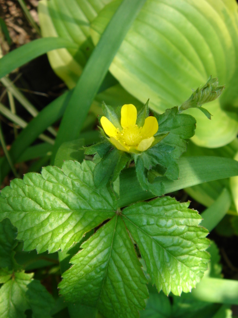 『ヘビイチゴ』より大きめの実をつけ、若干半日陰を好むそう。実は食べても毒はありませんが、おいしくもないそうです。