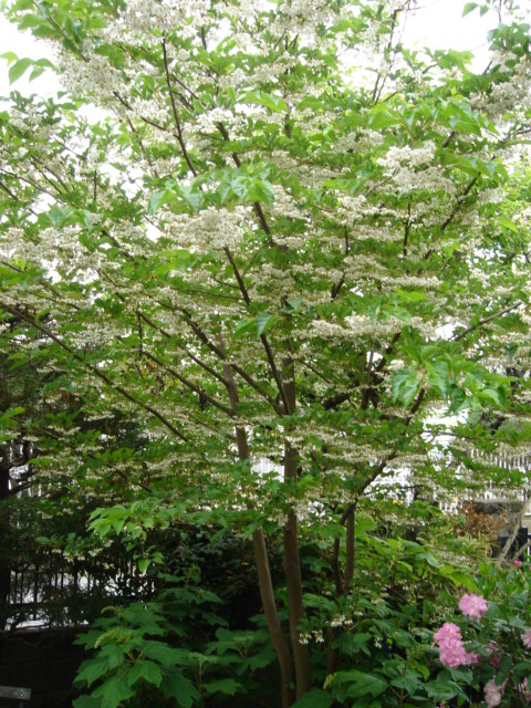 そんなことは知らんと、狭い庭で、『エゴノキ』が目一杯満開しています。→
