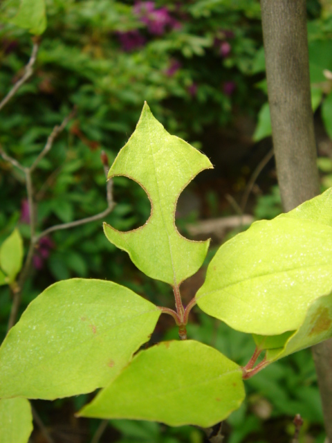 あまりの早業にこちらは撮れず、くり貫かれた葉のみ→