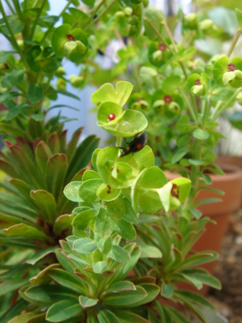 テントウムシや、早く恋して子孫を繁栄させて、幼虫共々、アブラムシを食べに来ておくれ~~