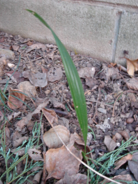 →その庭木の下あちこちに、 長さ15cm程度の葉っぱ1枚がピヨンっと。