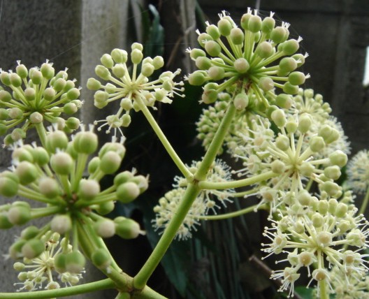 春には、頭にぐるりと白っぽい花を咲かせます。