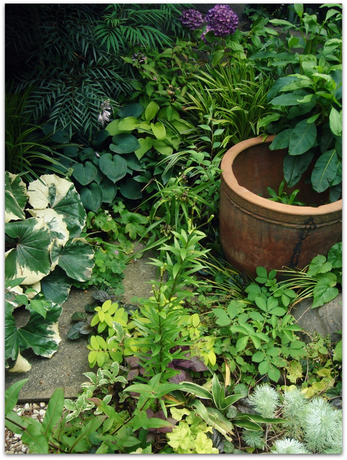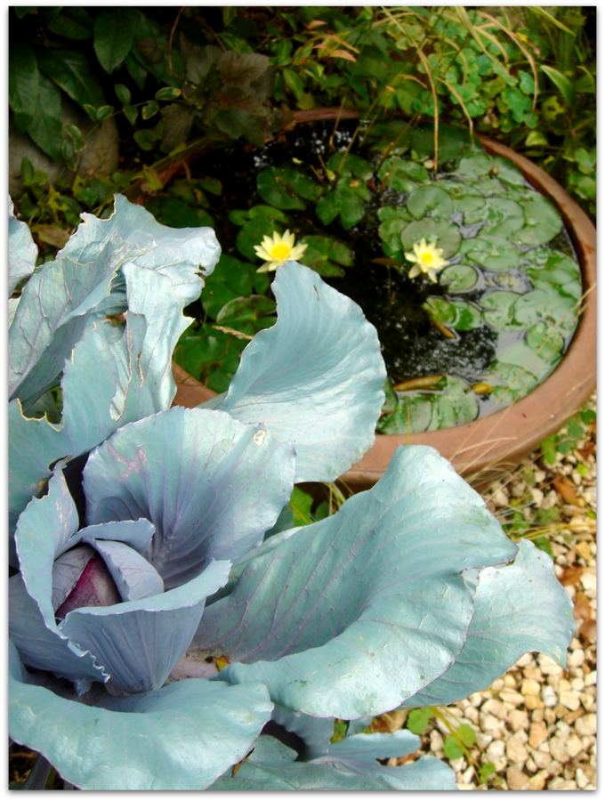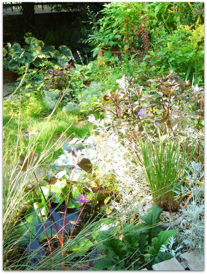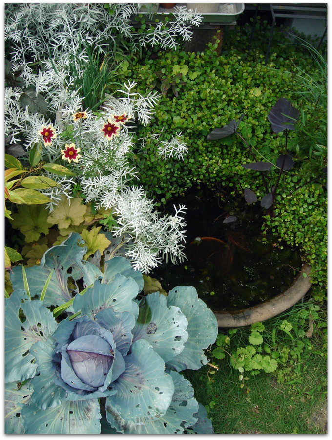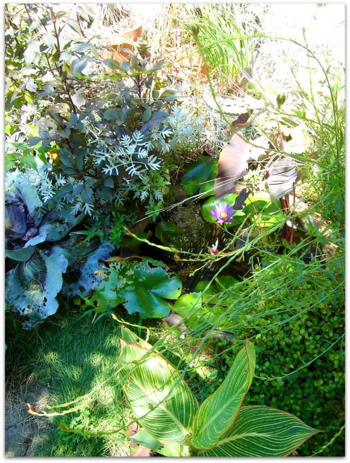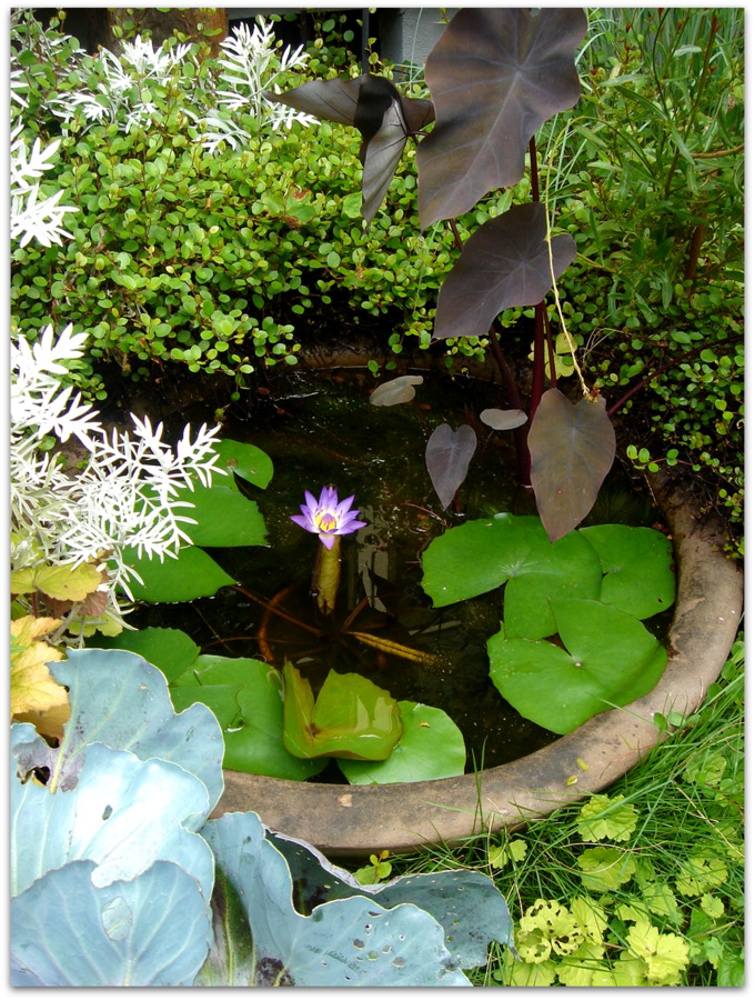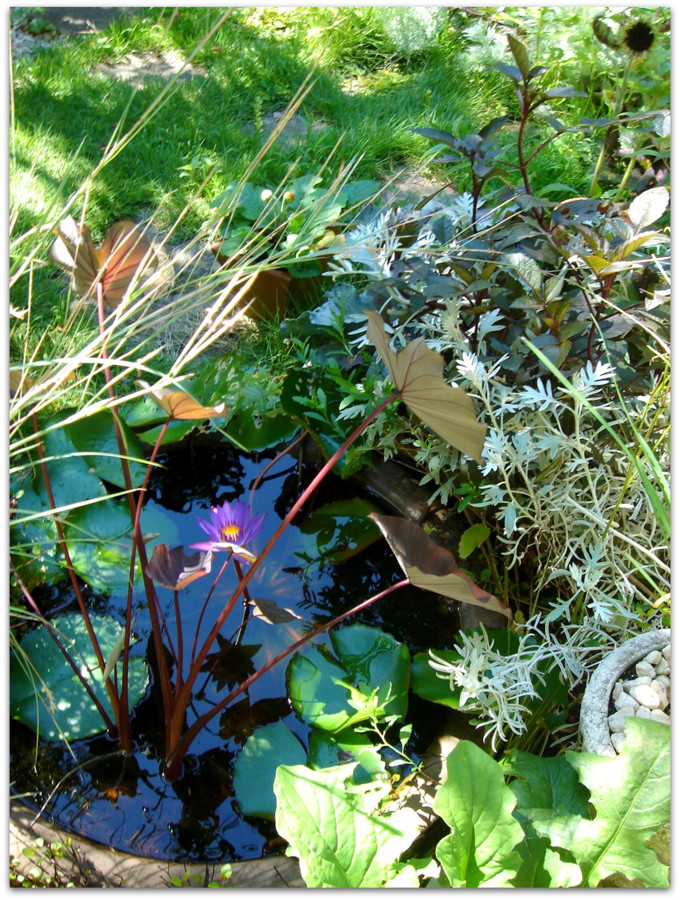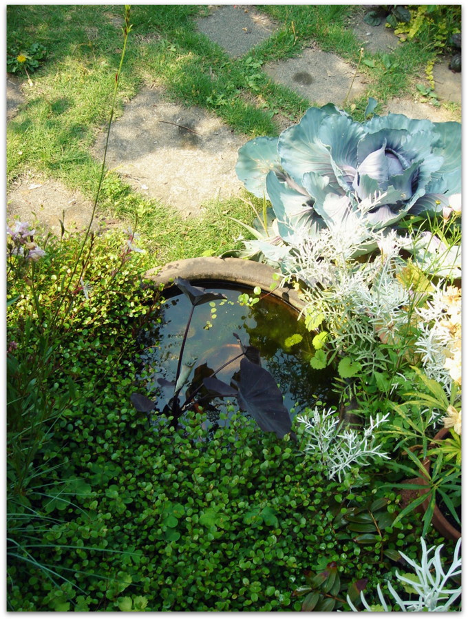半分埋めてある睡蓮鉢。