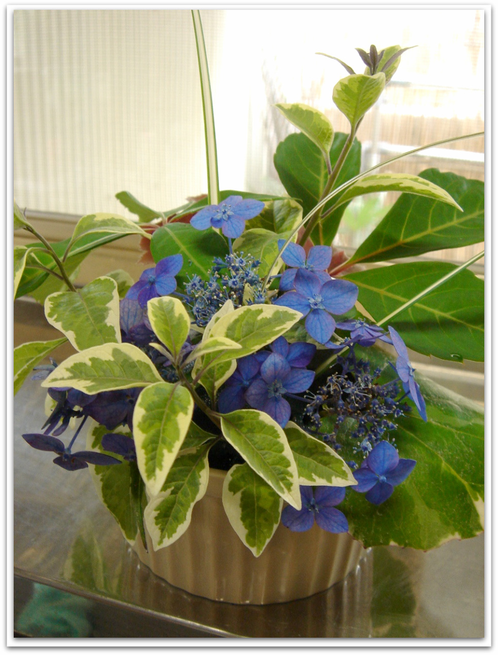 ←先週末、庭の植物オンリーで、小さなアレンジを作って、父の病室に持っていきました。