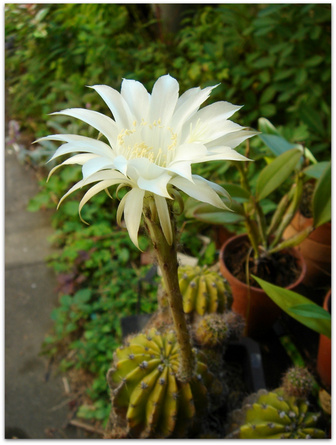 気にして見てみると、あちこちの軒先で、同じエキノプシス属のサボテンが、ピンクだったり、黄色だったりを咲かせてるのを見かけます。