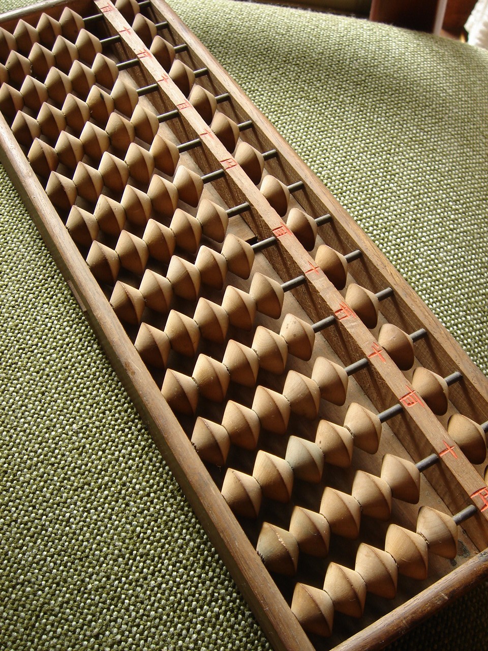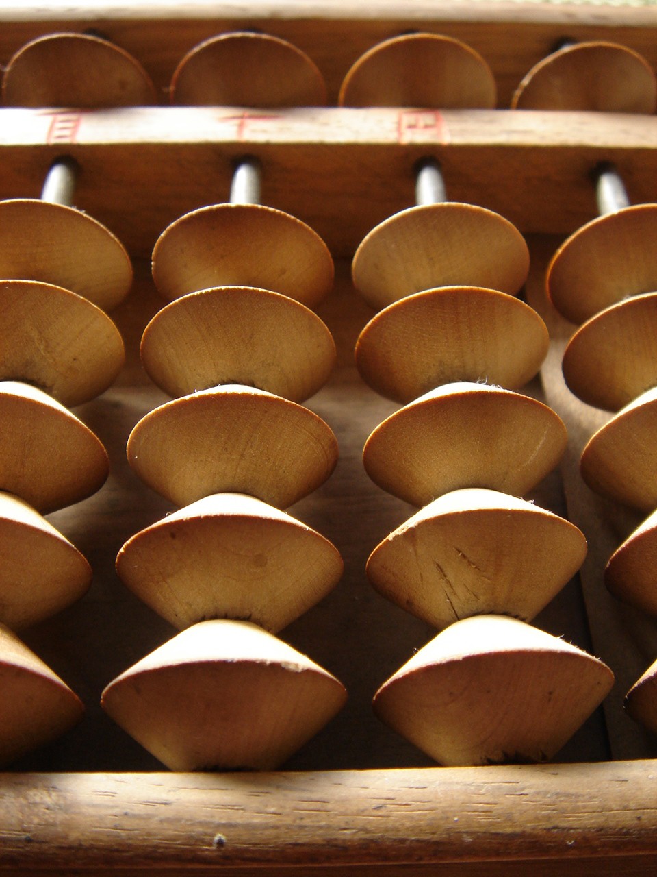 これは5つ玉ですが、ウィキペディアによると現在の4つ玉になったのは1935年、小学校での珠算教育が必修となった際からなんだそう。その昔、中国から来たときは、さらに、上が2玉あったそう。
