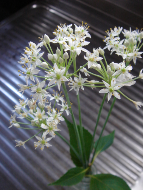 →激暑の庭に出ていて、ご近所さんから涼しげな白いニラの花を頂きました。(葉っぱは違う植物です)