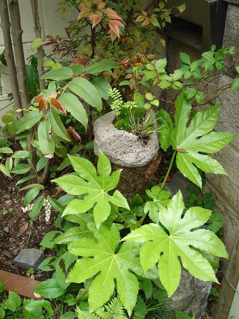 石(もらいもの)に植えてあるのは、姫フイリセキショウ(買った)、コアジサイ(もらった)、サンショウ(勝手に庭に生えてきた)、ツバキ(挿し木)。